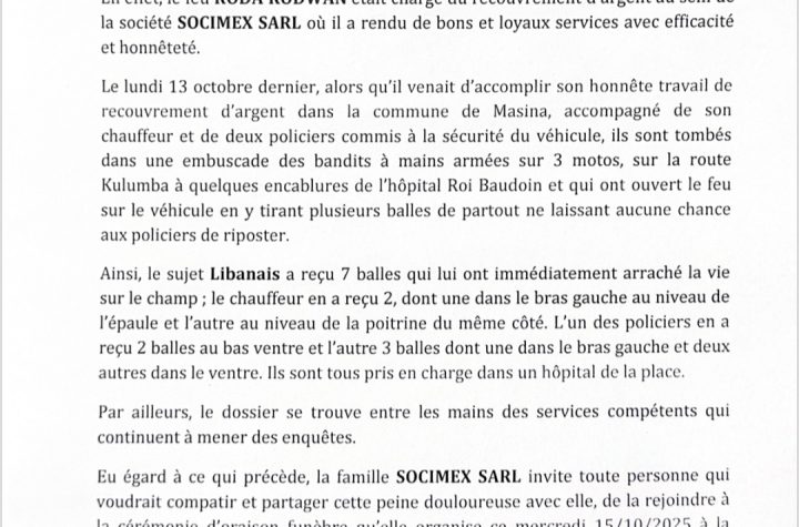 COMMUNIQUE La famille SOCIMEX SARL est en deuil, et souhaite fixer l'opinion publique en particulier et congolaise en général, sur...